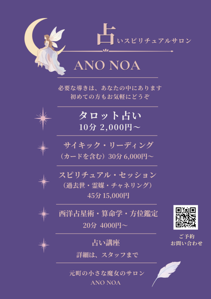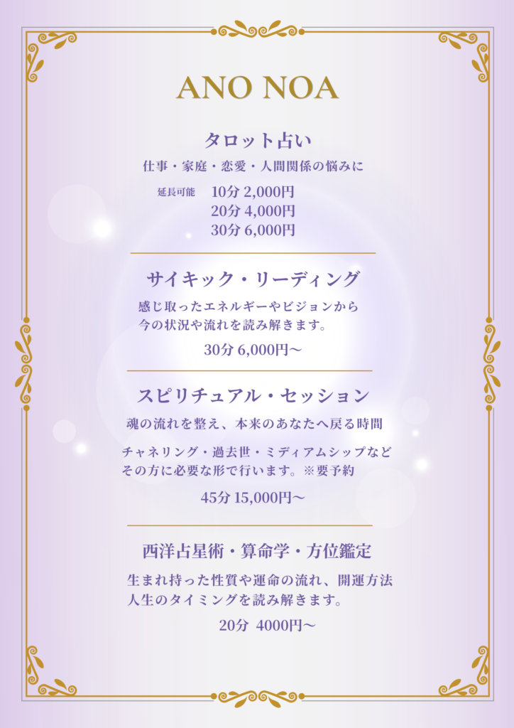 HOME > ブログ > サロン > サロン 看板メニューを新しくしました 2026年3月28日 サロンの看板と店内メニューを新しくしました。 はじめての方にも、安心してお入りいただけるようにシンプルでわかりやすいメニューにしています。 タロット占い(10分 2,000円〜) サイキック・リーディング スピリチュアル・セッション 西洋占星術・算命学・方位鑑定 どうぞお気軽にお立ち寄りください。 Twitter Share -サロン